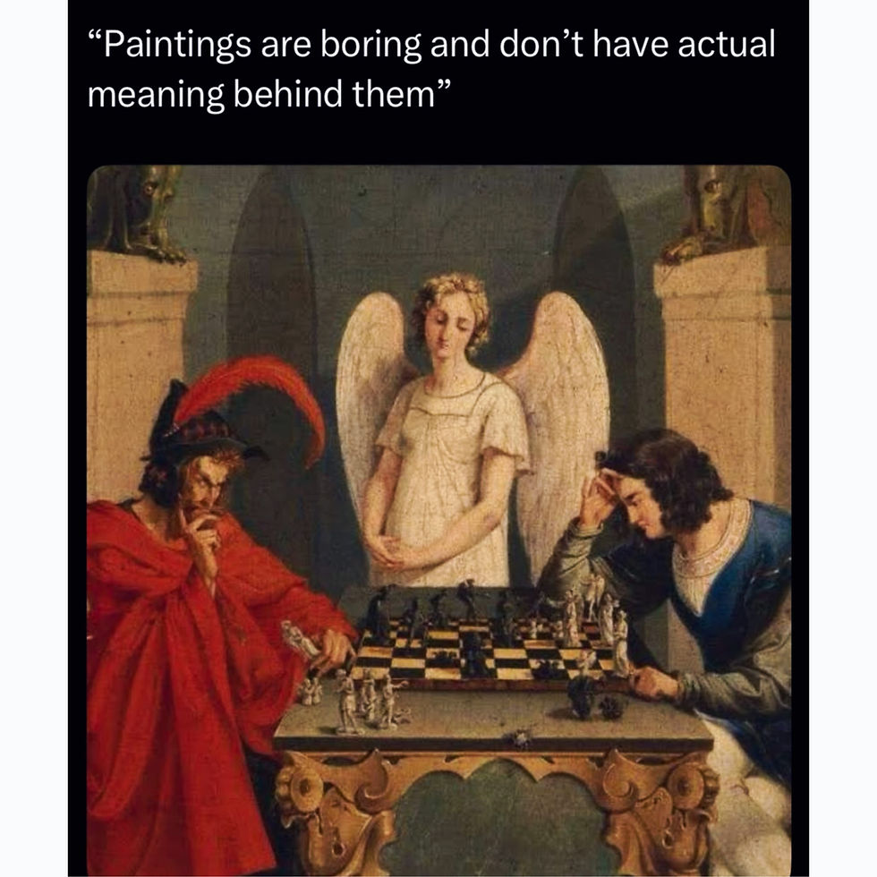 Friedrich Moritz August Retzsch's 1866 painting "Checkmate" portrays a tense, symbolic chess match between a young man and the Devil, with an angel quietly observing behind. The Devil, draped in red and exuding smug confidence, seems to have the upper hand, while the young man appears defeated, staring helplessly at the board. The scene represents a spiritual struggle a battle for the soul - where every move is a moral choice. Though the Devil believes he's won, the angel's calm presence hints at a deeper truth: the game may not be over, and hope still lingers, if the right move is found.